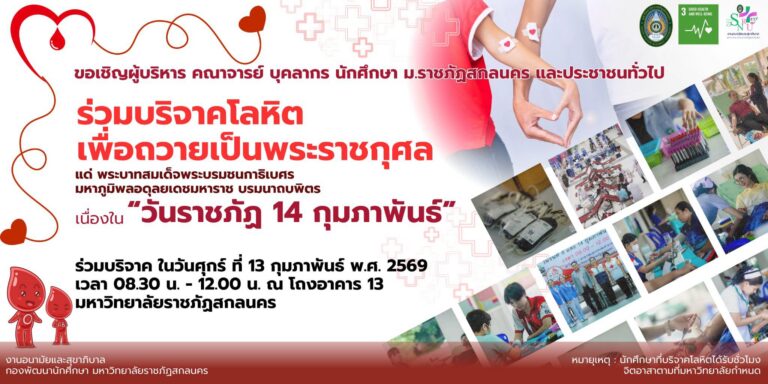 ขอเชิญผู้บริหาร คณาจารย์ บุคลากร นักศึกษา ม.ราชภัฏสกลนคร และประชาชนทั่วไปร่วมบริจาคโลหิตเพื่อถวายเป็ …