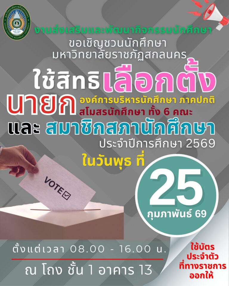 เชิญชวนนักศึกษา “เลือกตั้ง” นายกองค์การบริหารนักศึกษาภาคปกติ /นายกสโมสรนักศึกษา ทั้ง 6 คณะและสมาชิกสภานักศึกษา ประจำปีการศึกษา 2569