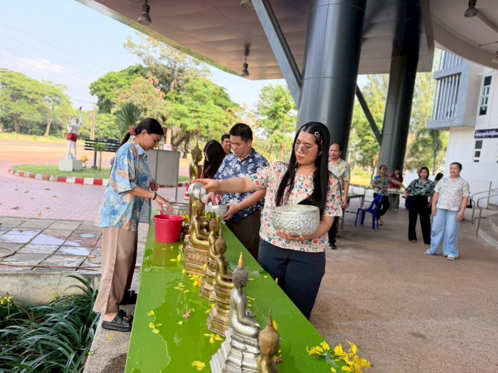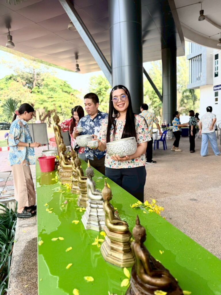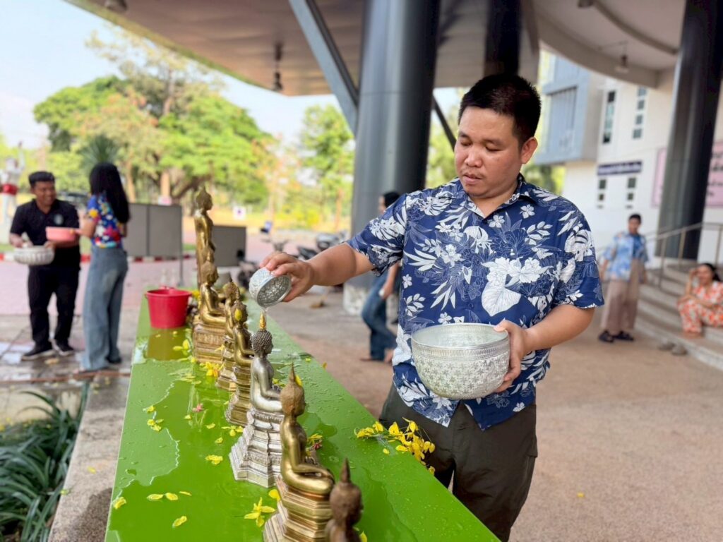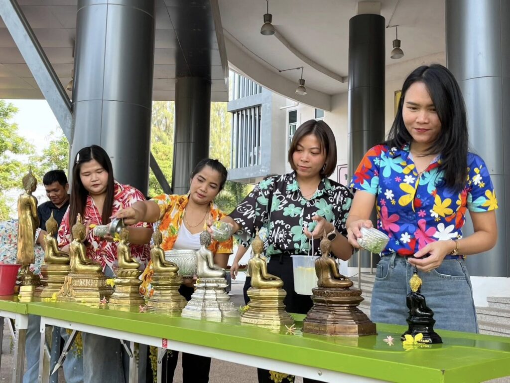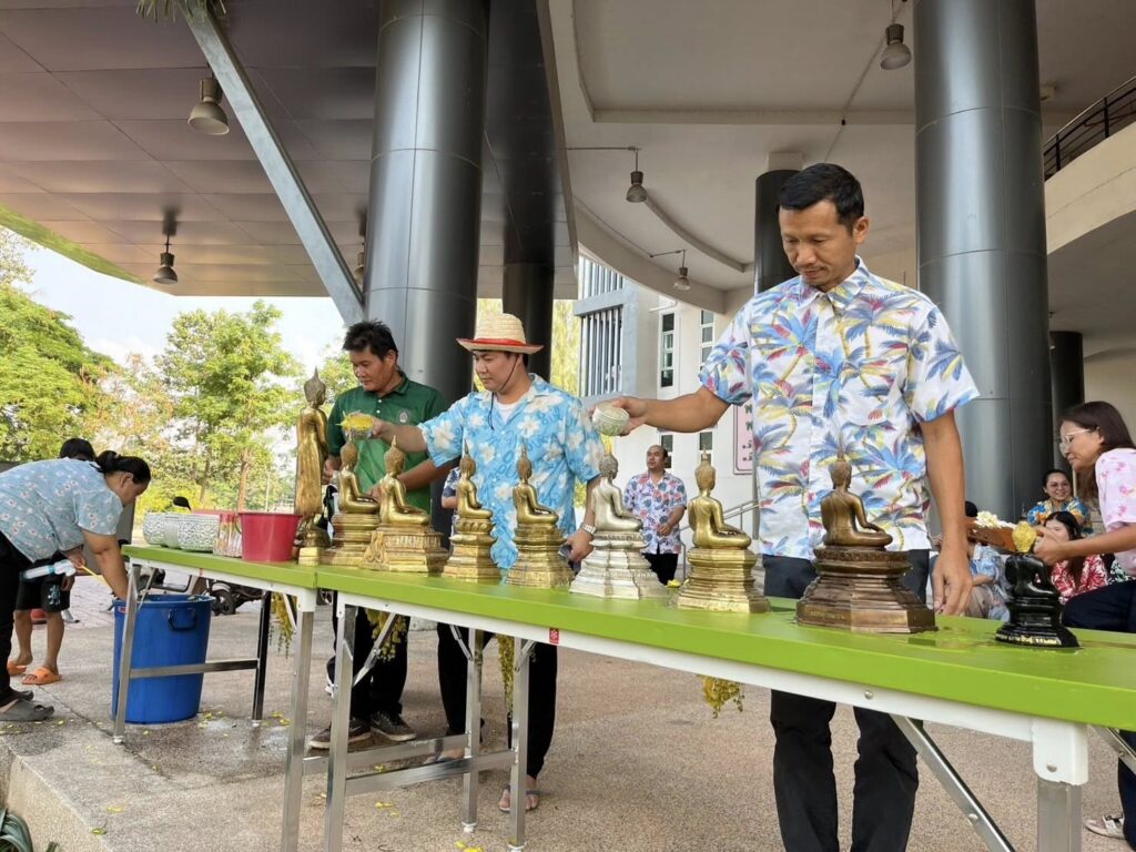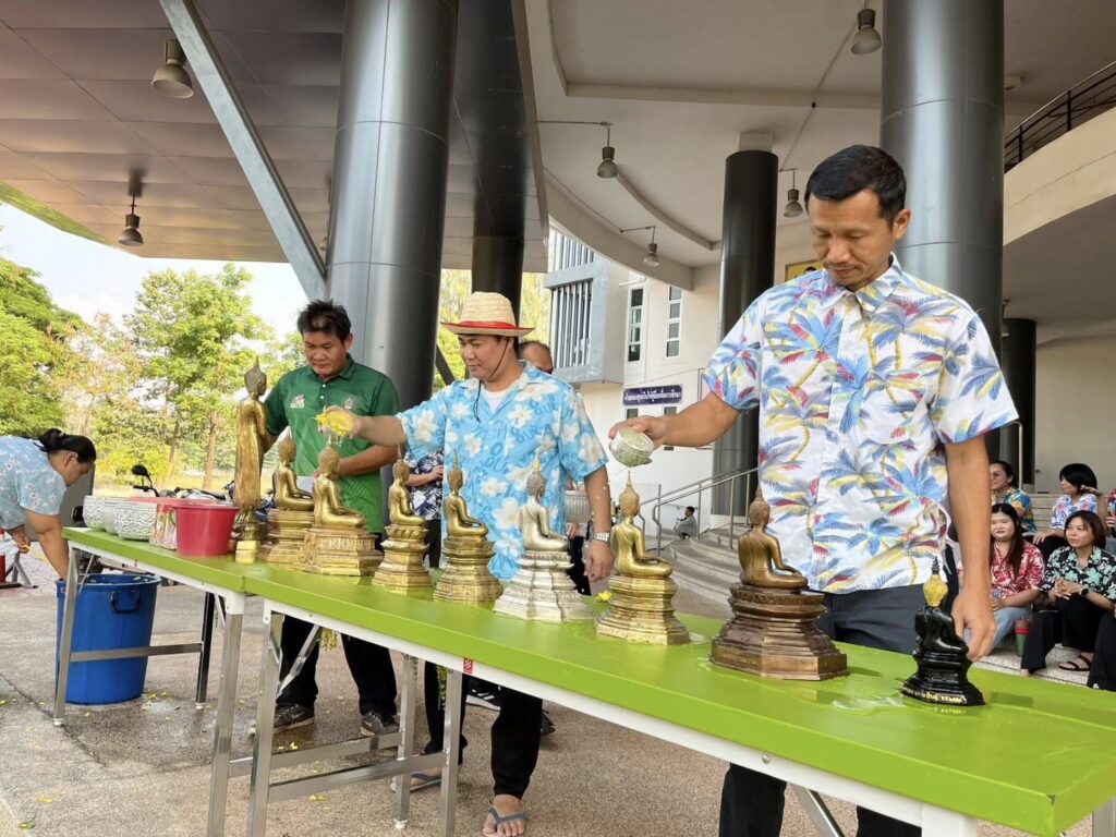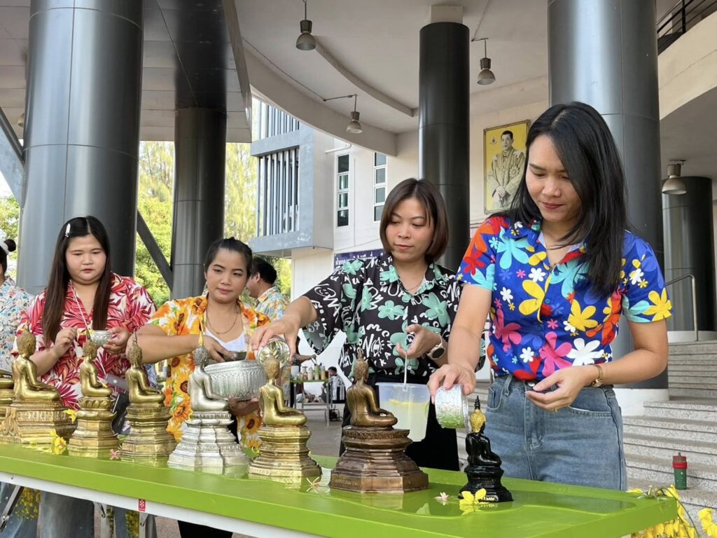กิจกรรมเริ่มต้นด้วย พิธีสรงน้ำพระพุทธรูป เพื่อความเป็นสิริมงคลและเป็นการเริ่มต้นปีใหม่ไทยด้วยจิตใจที่บริสุทธิ์ จากนั้นพิธีรดน้ำขอพรผู้บริหารกองพัฒนานักศึกษา เพื่อแสดงความกตัญญูกตเวทีและขอขมาลาโทษในสิ่งที่อาจล่วงเกินในปีที่ผ่านมา พร้อมรับฟังโอวาทและคำอวยพรเพื่อเป็นขวัญกำลังใจในการปฏิบัติงาน โดย อาจารย์ ดร.พรเทพ เสถียรนพเก้า รองอธิการบดี