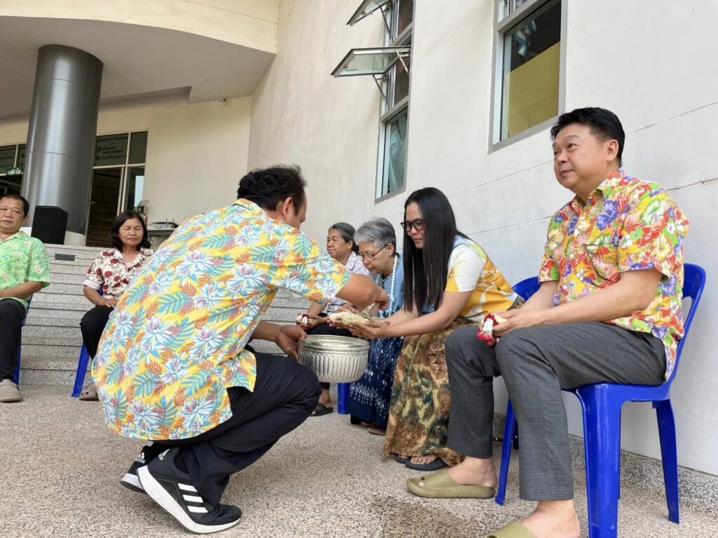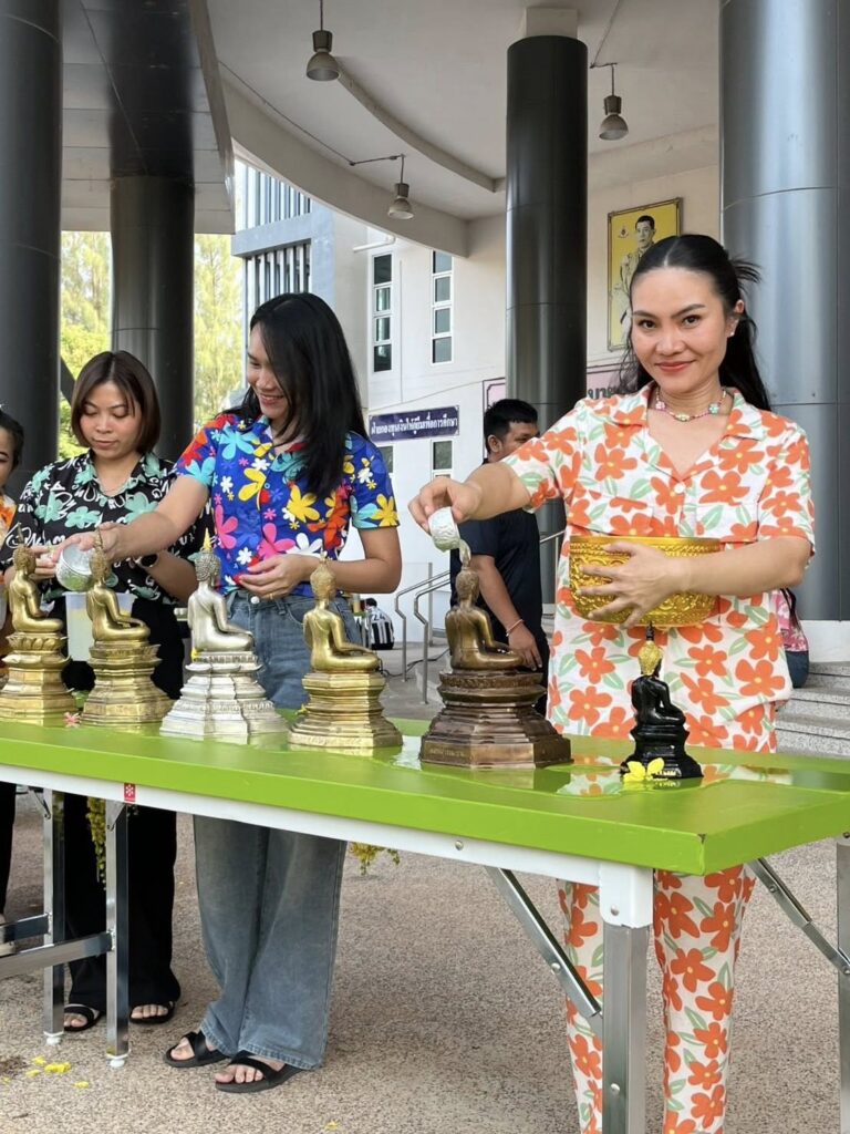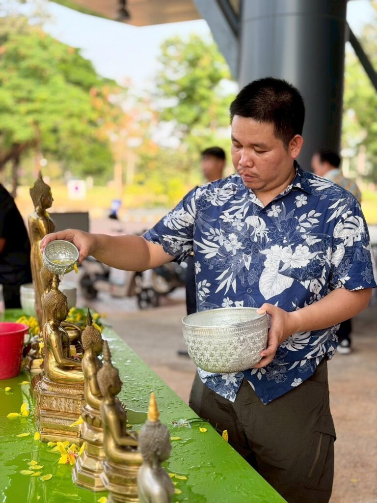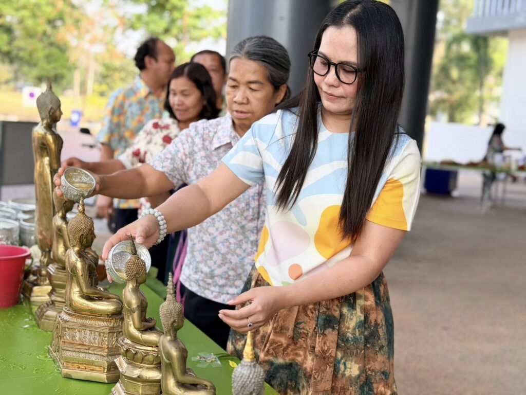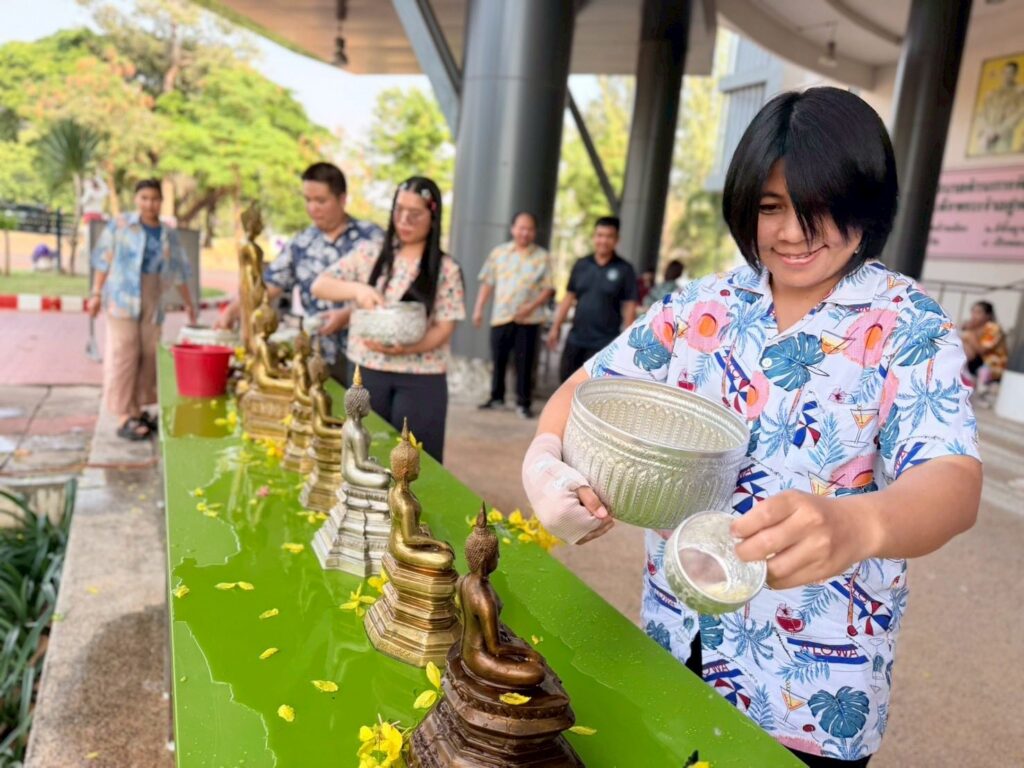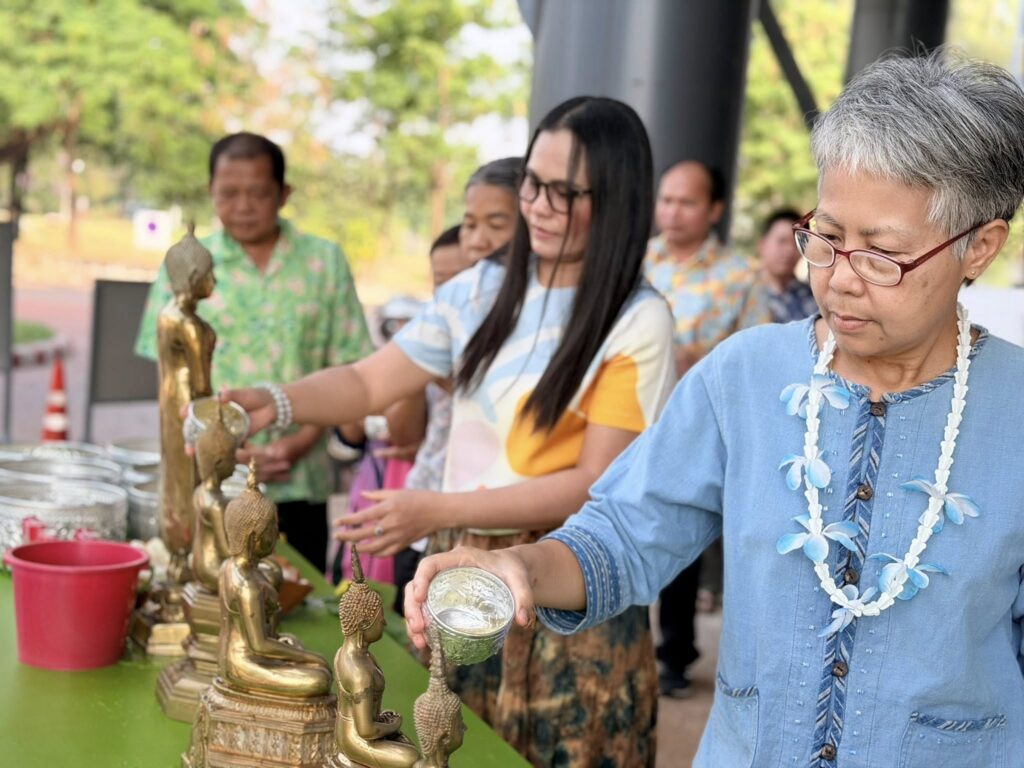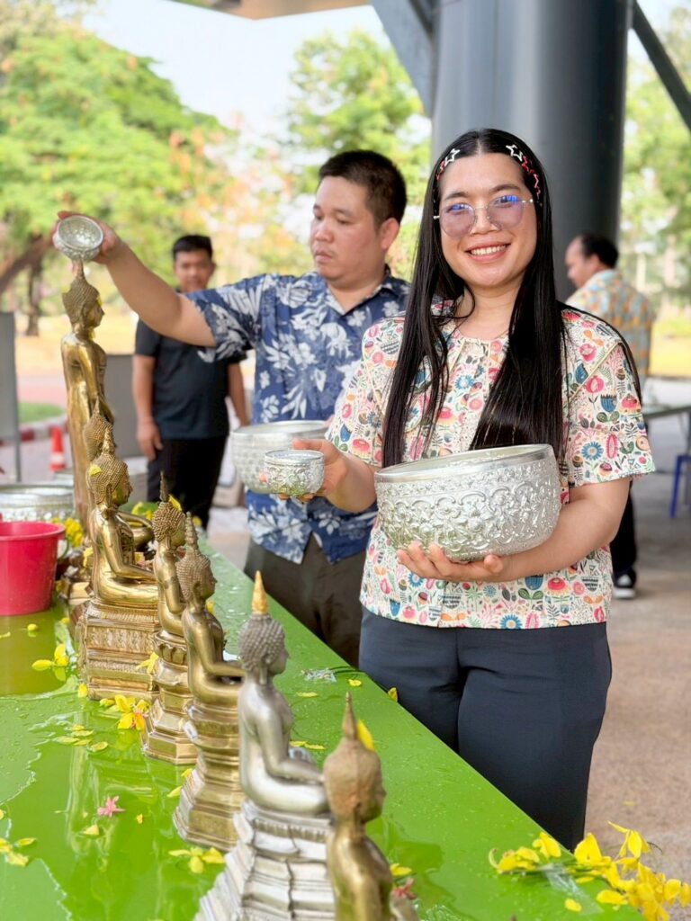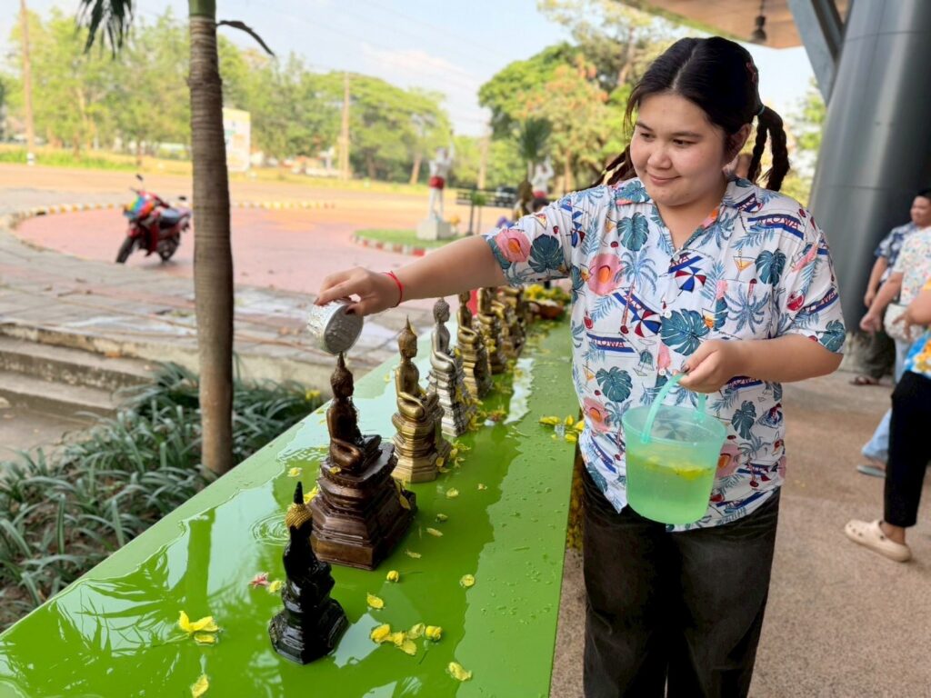 กิจกรรมเริ่มต้นด้วย พิธีสรงน้ำพระพุทธรูป เพื่อความเป็นสิริมงคลและเป็นการเริ่มต้นปีใหม่ไทยด้วยจิตใจที่บริสุทธิ์ จากนั้นพิธีรดน้ำขอพรผู้บริหารกองพัฒนานักศึกษา เพื่อแสดงความกตัญญูกตเวทีและขอขมาลาโทษในสิ่งที่อาจล่วงเกินในปีที่ผ่านมา พร้อมรับฟังโอวาทและคำอวยพรเพื่อเป็นขวัญกำลังใจในการปฏิบัติงาน โดย อาจารย์ ดร.พรเทพ เสถียรนพเก้า รองอธิการบดี